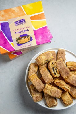 This gift box has eight pieces of classic Rugelach—toasted walnut with currants—and eight pieces filled with apricot jam.