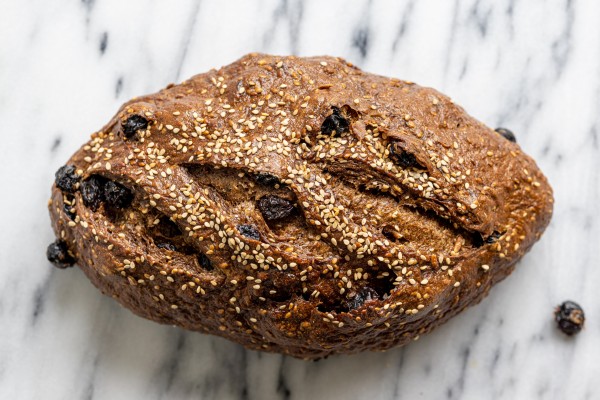 Pumpernickel Raisin is our traditional pumpernickel bread made with organic wheat flour and real pumpernickel flour, stuffed with huge, juicy Red Flame raisins, finished off with a sprinkle of sesame seeds. The result is a loaf that tastes “adult” in the best sense of the word. Deep and rich, with an old fashioned molasses sweetness. Try a few warm slices with your morning coffee—or an evening port.