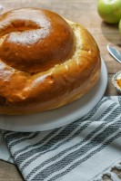 It became traditional among Eastern European Jews to bake challah in round, turban-like loaves. The shape is said to signify the desire for a full, complete year. It’s also made richer and sweeter than plain challah, part of an annual effort by Jewish cooks to bring home a better, sweeter, more fruitful year. Towards that end, bakers add more honey, raisins, additional eggs, and liqueurs – sometimes even saffron. We add a generous portion of extra large Red Flame raisins that we first soak in ultra-rich Myers’ Dark Rum before folding into the dough.