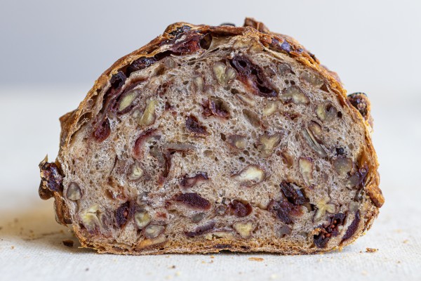Loaded with dried cranberries and toasted pecans held together with an organic flour dough, this loaf is the kissing cousin to our extremely popular Pecan Raisin Bread.
